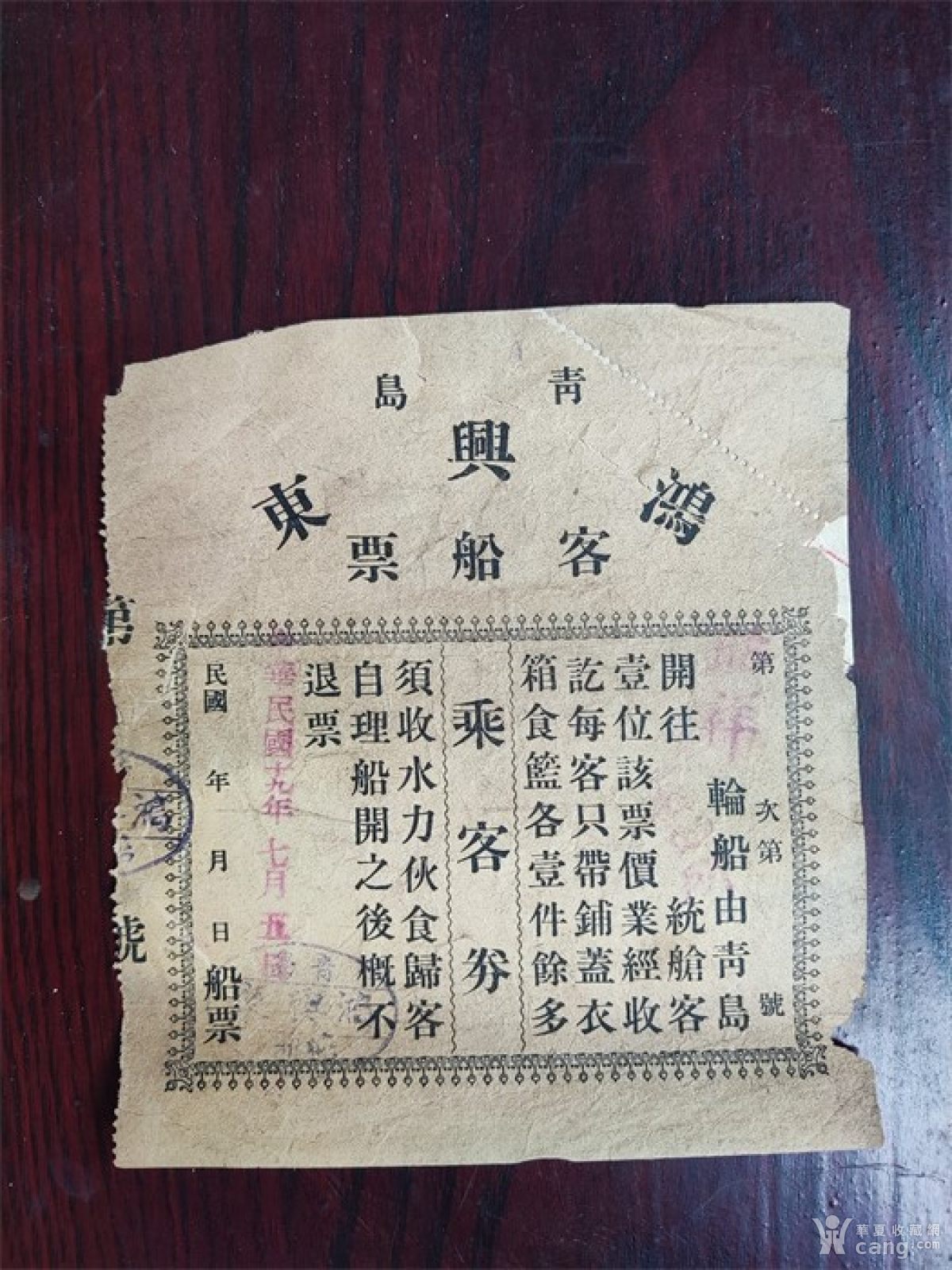地摊>杂项>文房>民国十九年青岛鸿兴东號由青岛开往日照石臼所的客船票> 收藏分享 举报民国十九年青岛鸿兴东號由青岛开往日照石臼所的客船票编号:SD206956 更新时间:2025.04.19包邮¥0一口价 浏览5送去鉴定 运费:包邮立即购买不支持七天无理由退货安全支付消费保障店主推荐非卖品/勿拍包邮¥10000000 36包老,特价包邮¥0 23和田黄玉南瓜雕件包邮¥0 17手绘胭脂壶,全品完整包邮¥0 34和田黄玉灵芝纹牌、包邮¥0 14和田黄玉龙纹斧包邮¥0 16永乐。。。。包邮¥0 31顺治五彩花菇包邮¥0 28和田黄玉诗文环包邮¥0 12老坑玉壁 望子成龙包邮¥0 17藏品描述藏品展示服务保障 手机购买 安全提示为保障您的利益,请在平台下完成交易。切勿私自微信、支付宝、银行转账,谨防诈骗!平台外产生的交易纠纷,将不受平台资金保护。藏品描述民国十九年青岛鸿兴东號由青岛开往日照石臼所的客船票藏品展示服务保障消费者保障服务该卖家已缴纳消保保证金,您可放心购买。支付方式支付宝安全支付安全支付余额支付网银支付