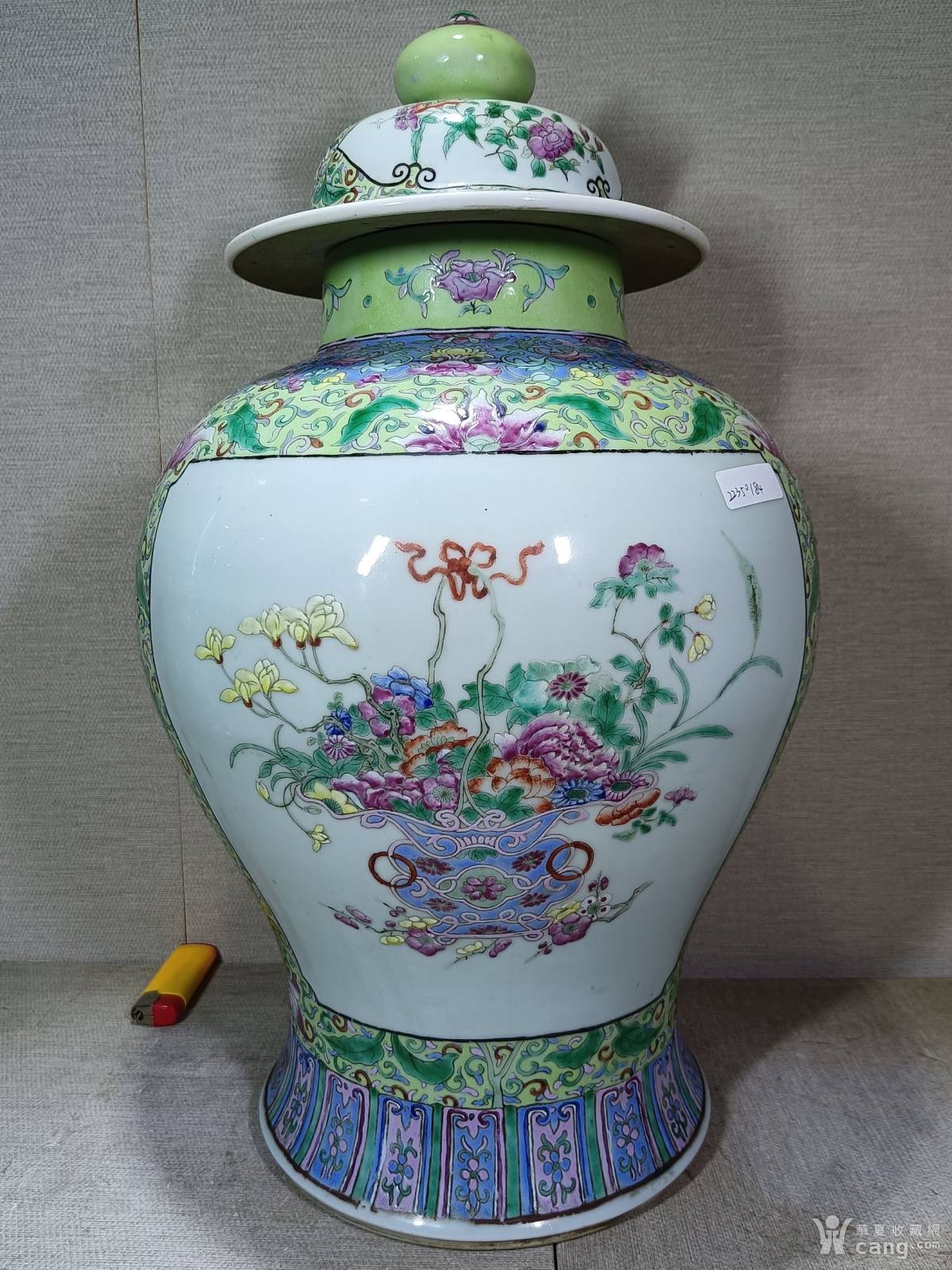 (已让)晚清绿地粉彩开窗“锦上添花”将军罐