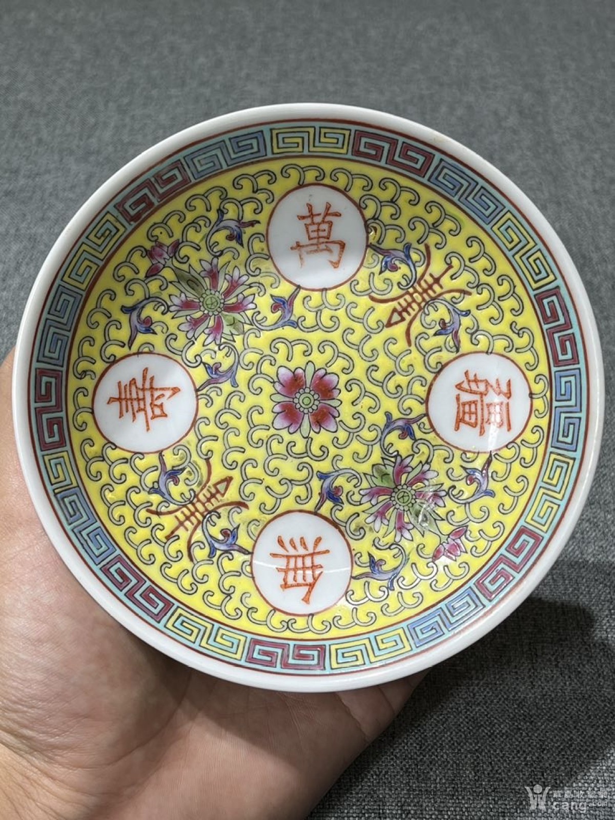 民国时期黄地粉彩缠枝花卉开窗「万寿无疆」赏盘/杯托/壶承