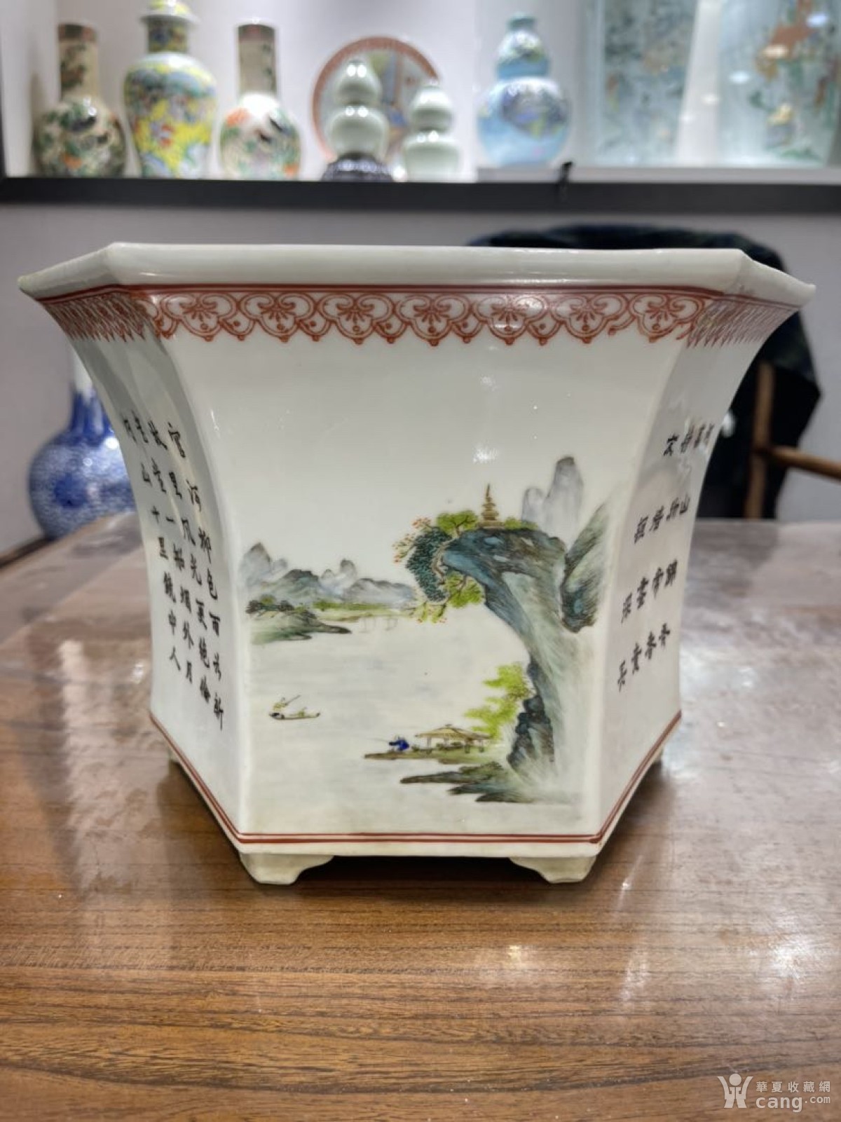 海外回流国外新到50年代山水诗文六方花盆
