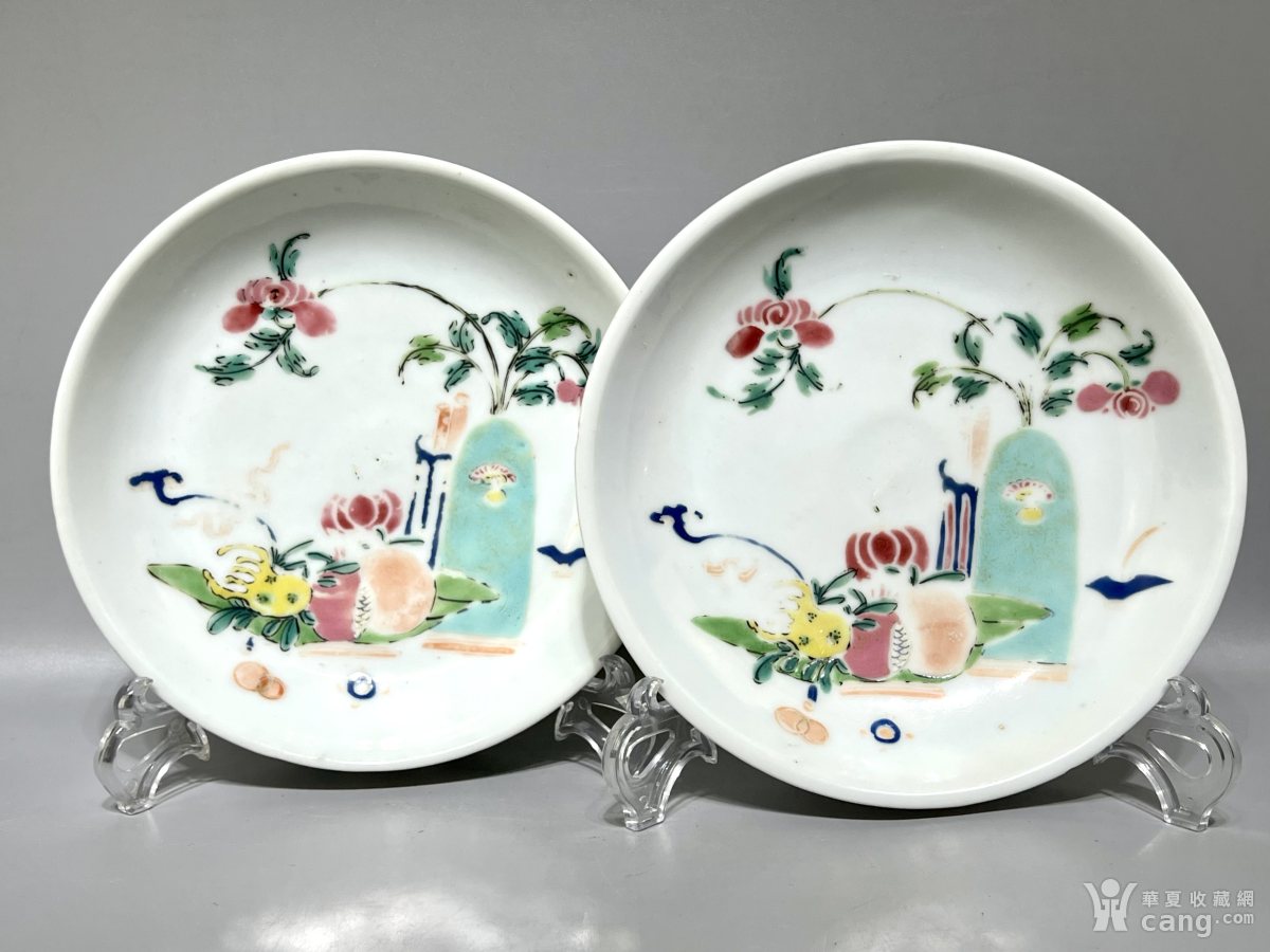 清雍正德化精品粉彩佛手石榴南瓜博古花卉纹盘一对