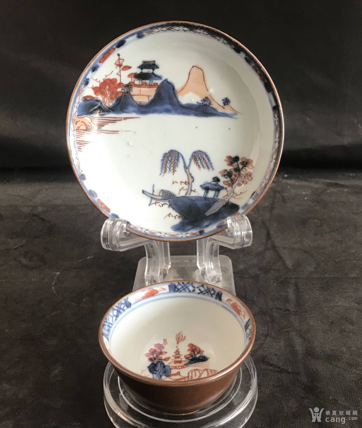 全品清康熙外紫金釉内青花加彩“山水纹”杯碟。