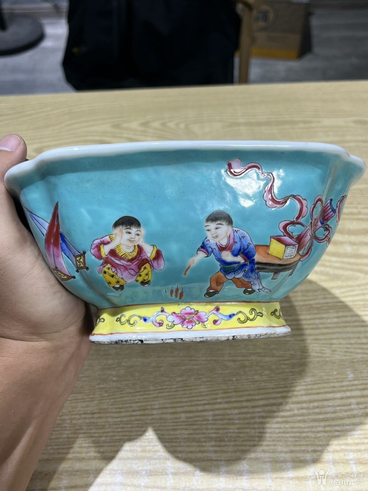 民国时期粉彩松石绿地「童子闹春图」四方倭角供盘/果盘