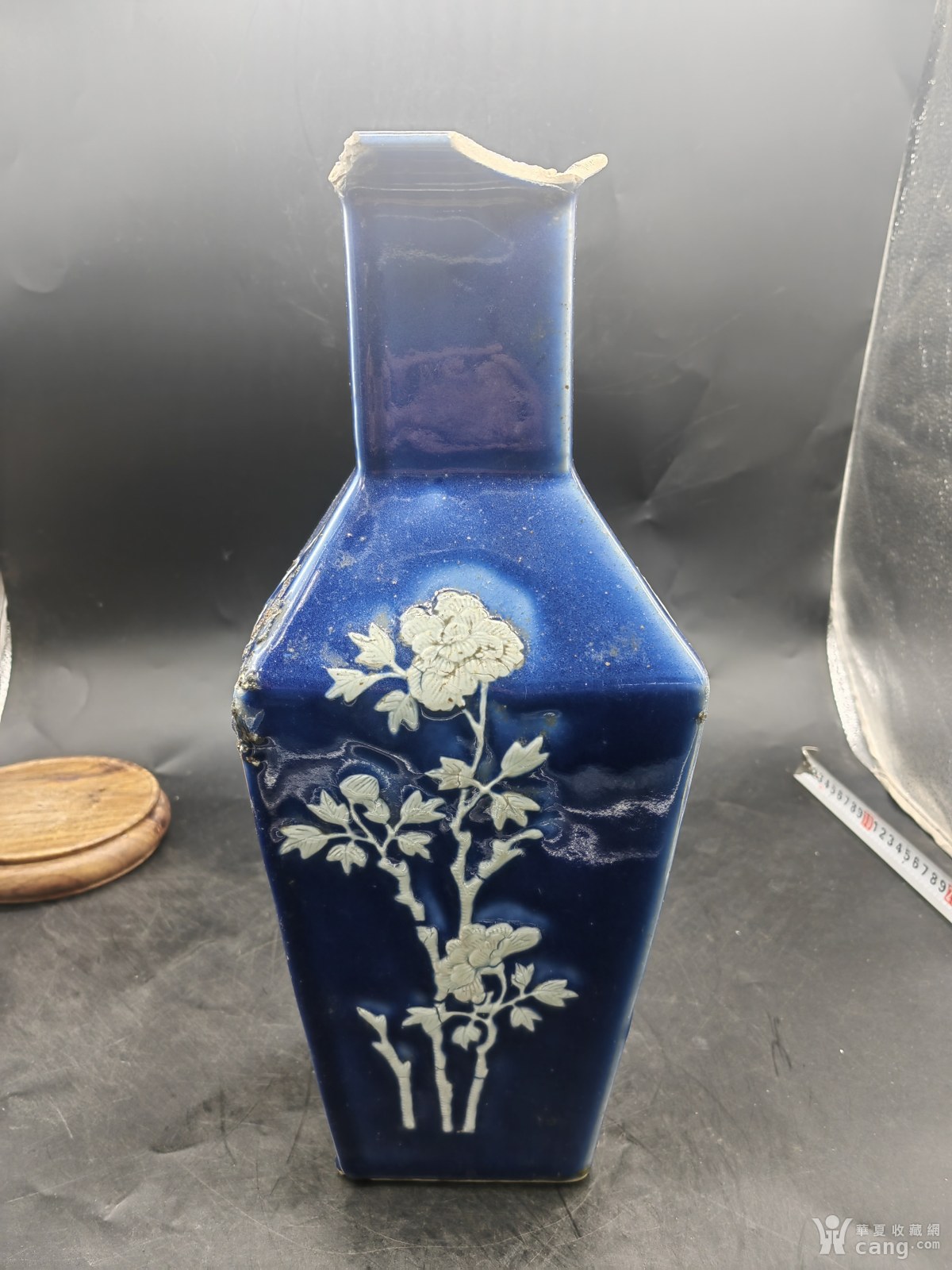 清代祭蓝堆白花四方瓶