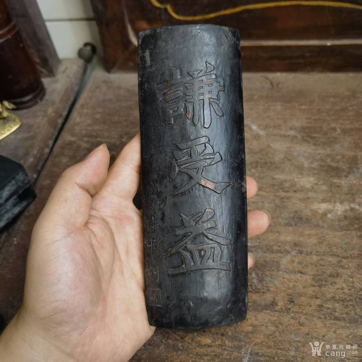 老竹雕谦受益臂搁,长19.8,宽7,早年后上过黑漆,