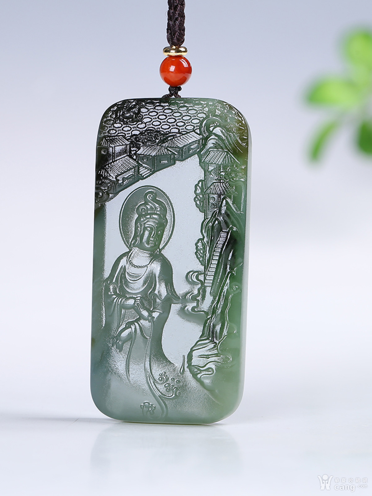 [福洒人间]和田玉碧玉观音山水福居牌子挂件吊坠46.90g