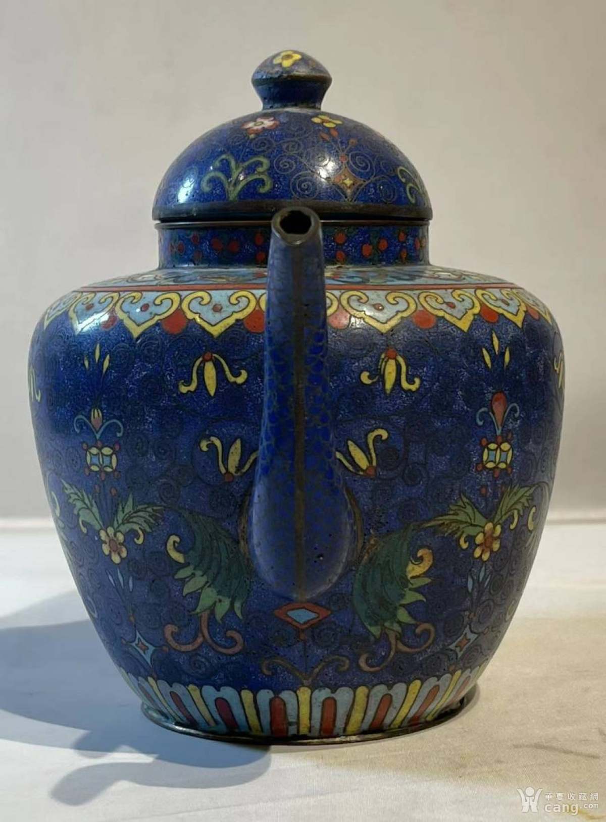 铜胎掐丝鎏金宝珠形盖钮蓝地缠枝花纹珐琅执壶