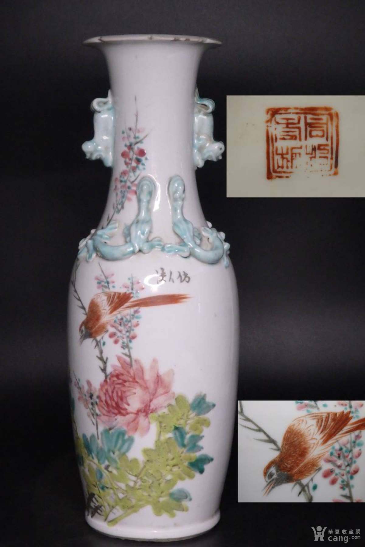 葵口双狮耳肩附四螭龙花鸟纹诗文粉彩瓷瓶