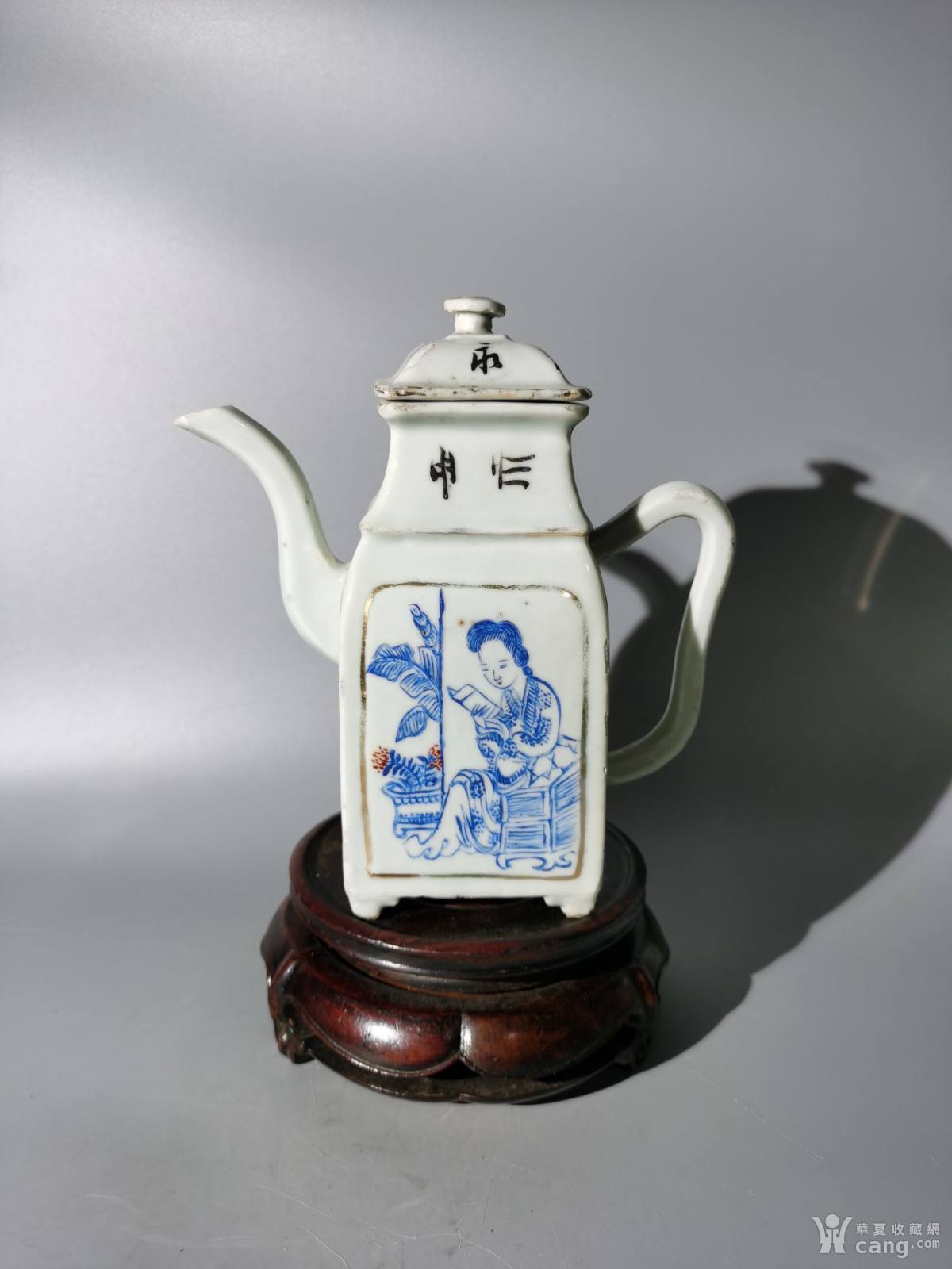民国蓝彩仕女诗文四方壶