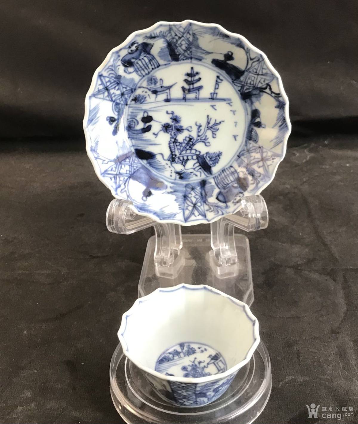 清康熙“山水人物纹”花口型杯碟。