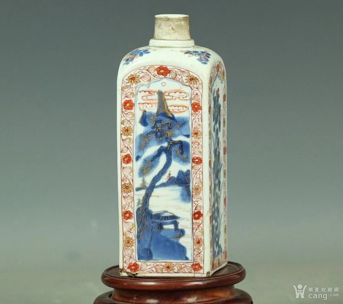 10484#古玩古董瓷器清代康熙年山水青花矾红描金花卉四方瓶