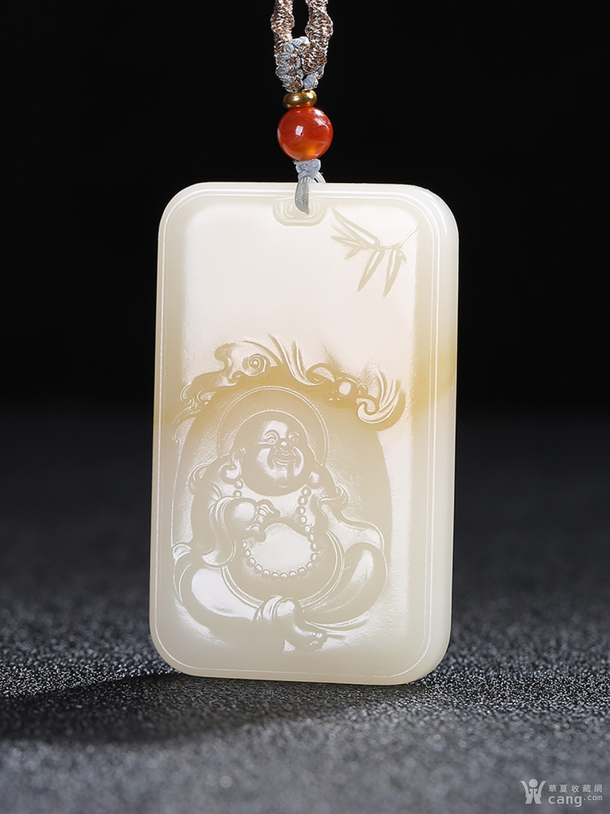 [佛引福来]和田玉糖白玉弥勒佛蝙蝠竹节牌子吊坠42.90g