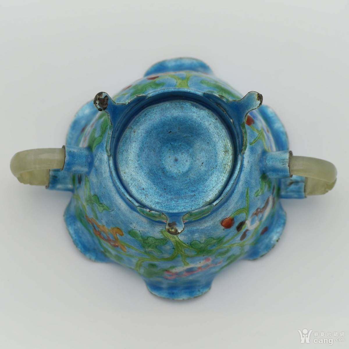 银胎三足式嵌玉双执耳花卉纹烧蓝花口杯