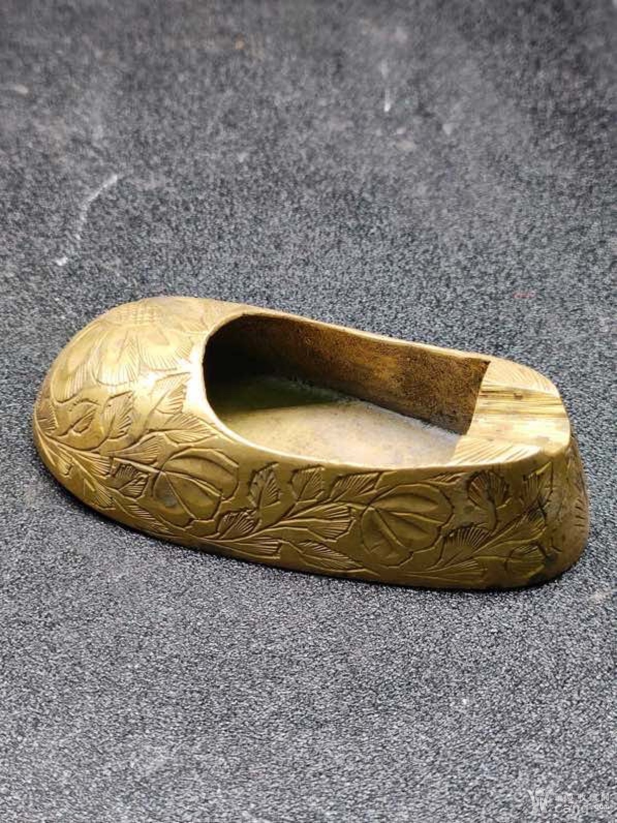 民国铜鞋子笔洗,周身攒刻花卉,铜质精良,包浆温润老道