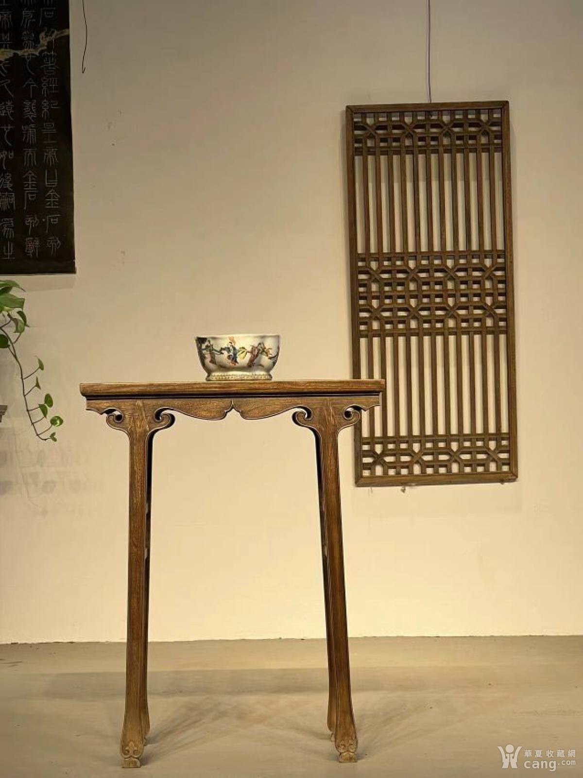 【 插肩榫剑腿足香几 】 此剑腿桌为插肩榫结构,牙板透雕如