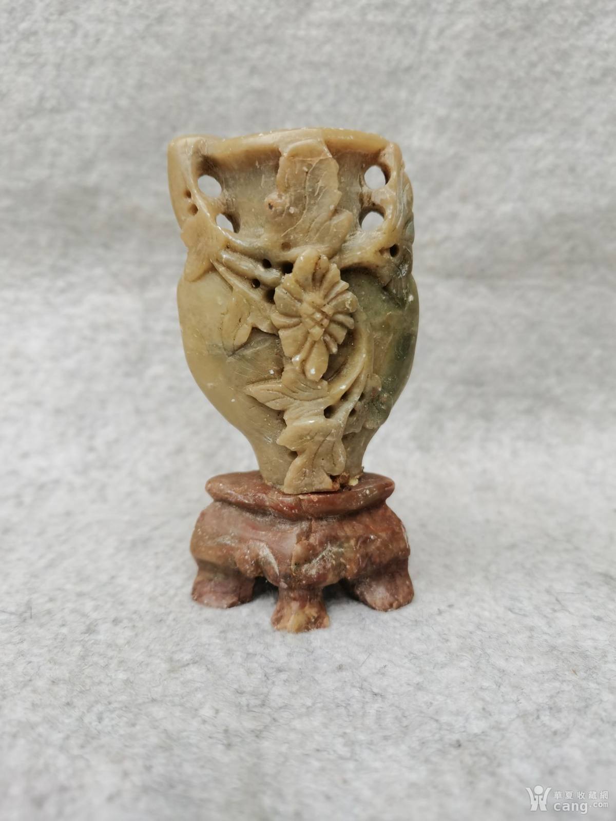 老寿山石雕花瓶,镂空雕花卉,皮壳包浆自然,小巧精致