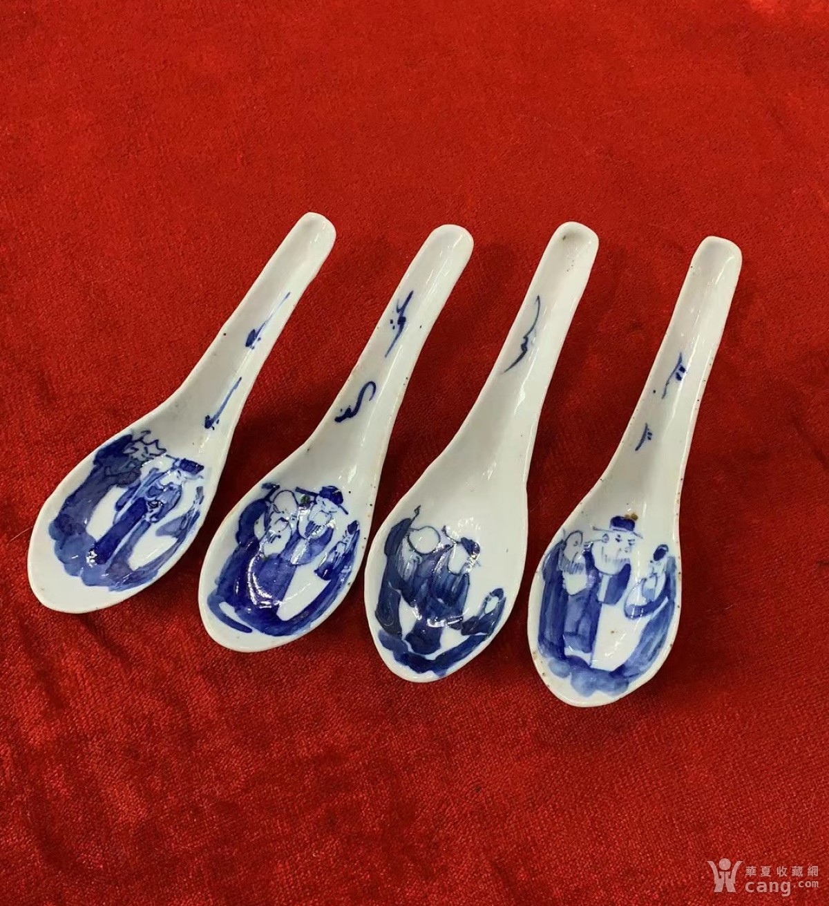 111#古玩景德镇瓷器收藏福禄寿三星人物青花餐具调羹4只美品