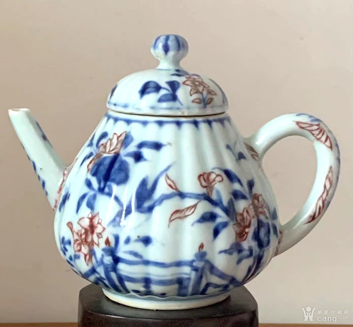 10302#古玩古老货真品清代康熙瓜棱青花釉里红花卉茶壶茶具