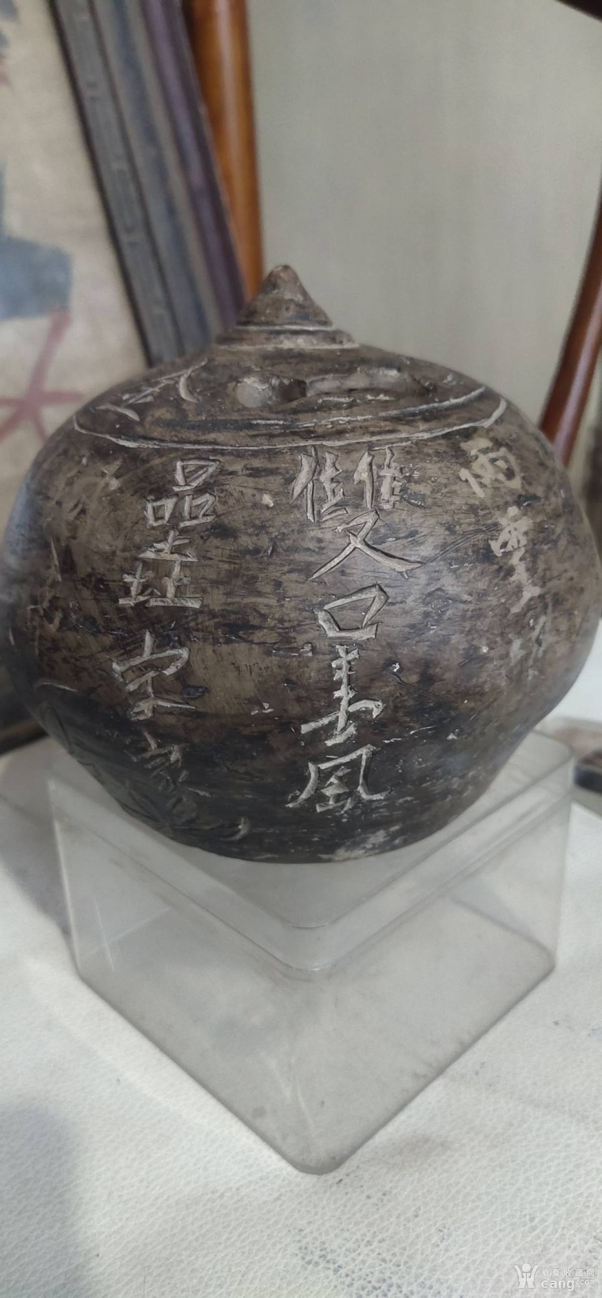 明代白釉刻花花卉诗文储蓄罐一个,完整。