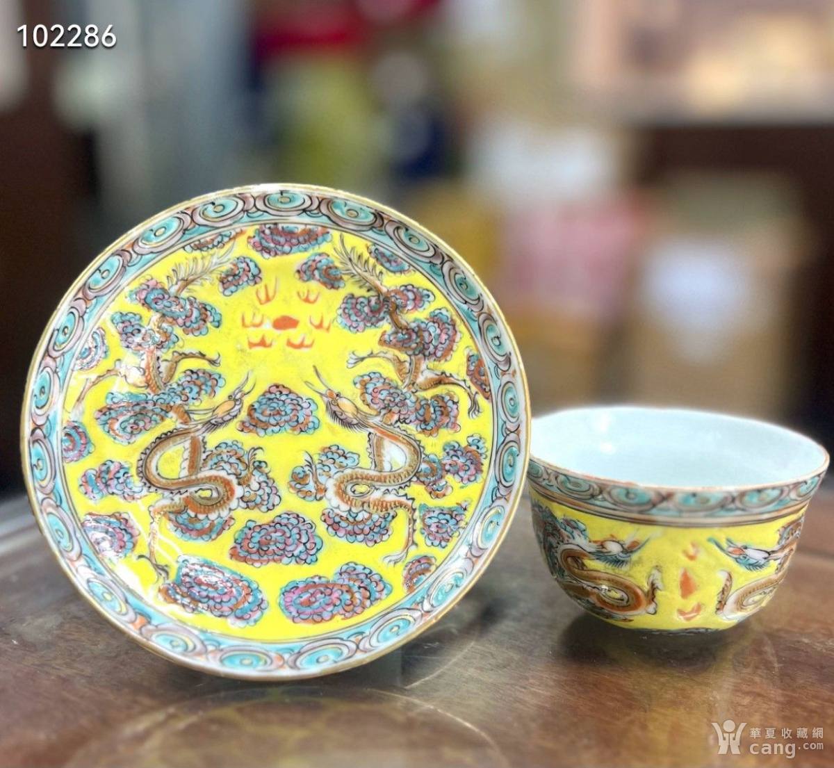 民国黄地五彩双龙纹杯碟一套 古董古玩古瓷收藏包老保真民国粉彩