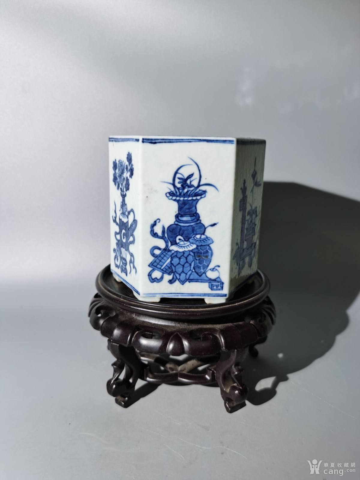 道光六棱青花博古纹温酒器