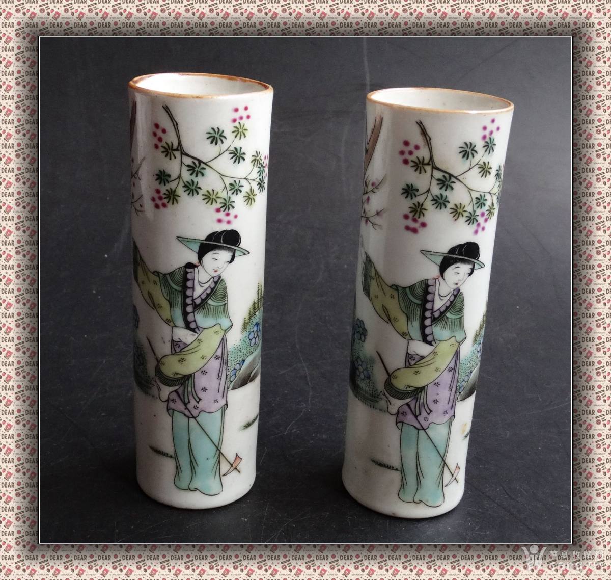 31#微瓶古玩瓷器唐子桢书底款侍女纹彩绘微型帽筒小摆件一对