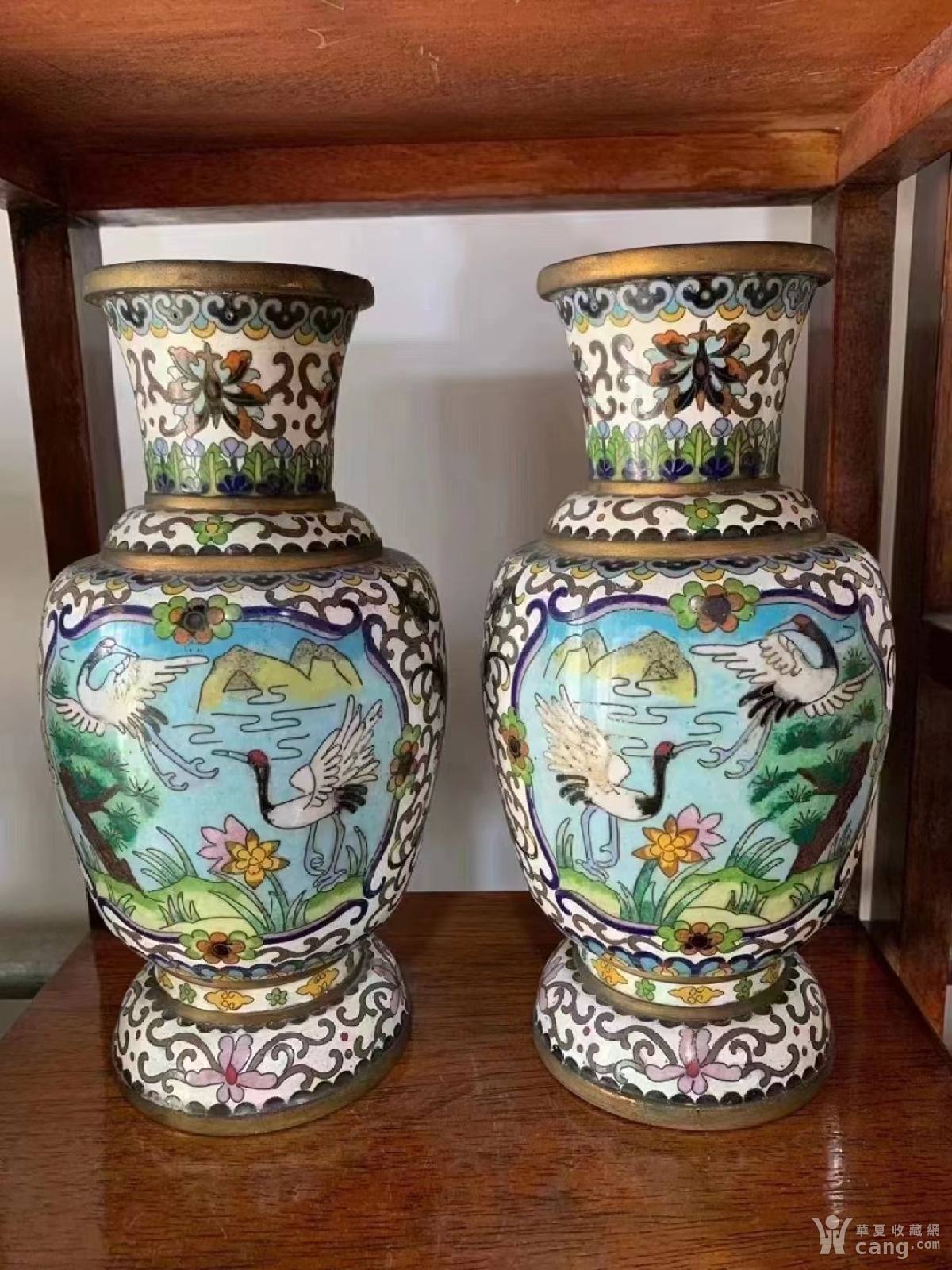 民国松树仙鹤景泰蓝赏瓶一对,