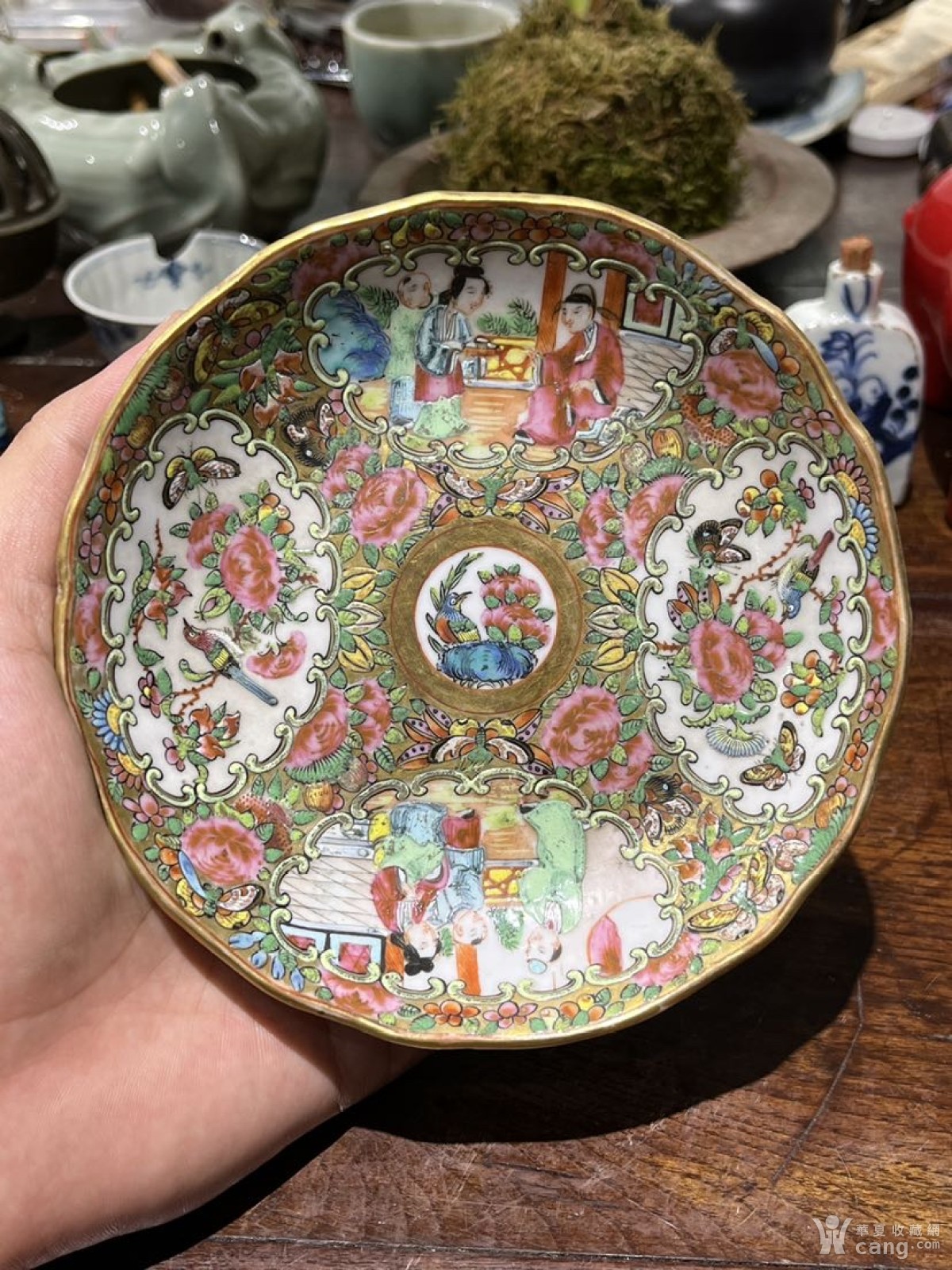 清代嘉道时期光彩「人物花鸟故事」花口赏盘/杯托/壶承