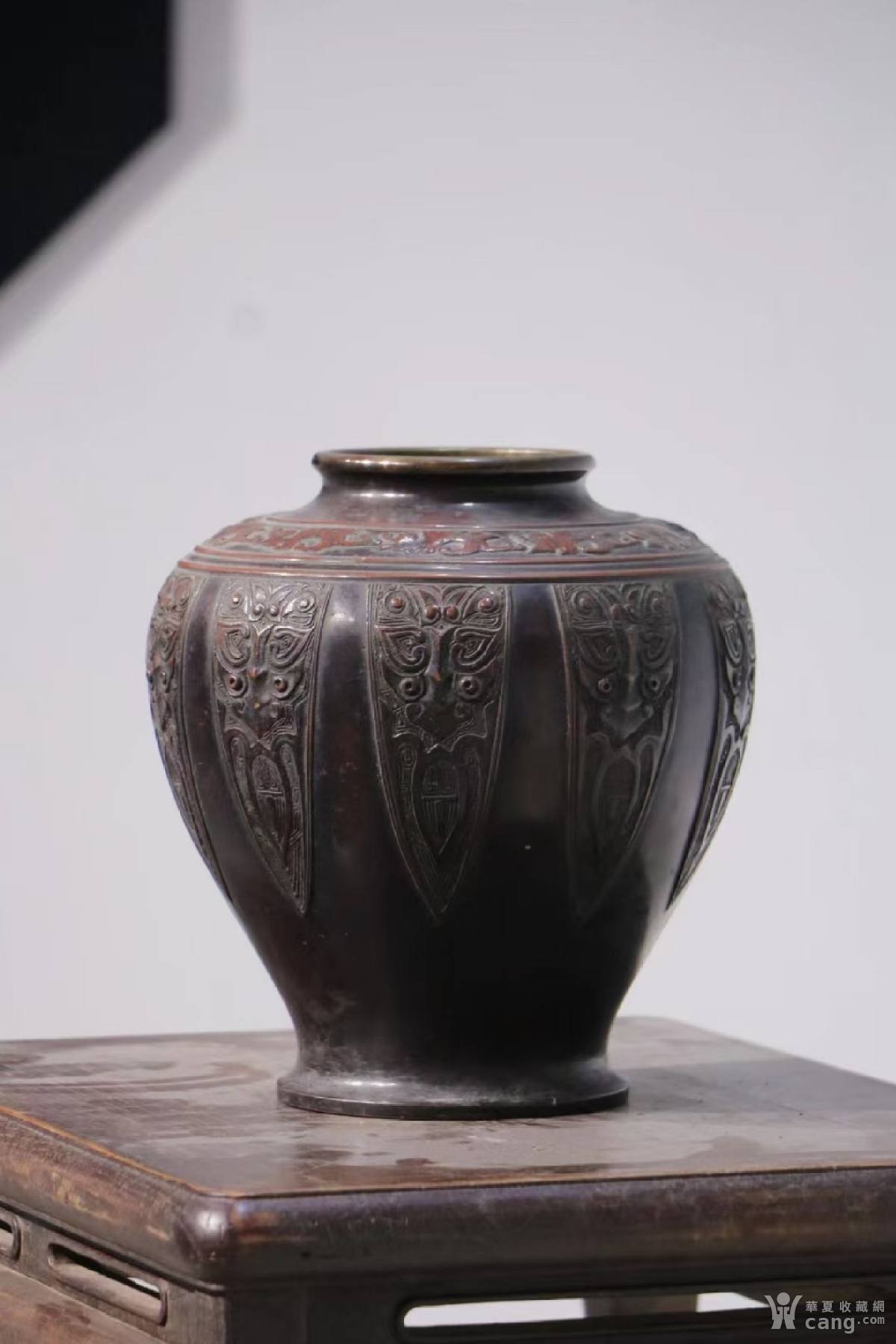 铜*饕餮纹罐; 饕餮纹罐,微撇口,粗束颈,溜肩,