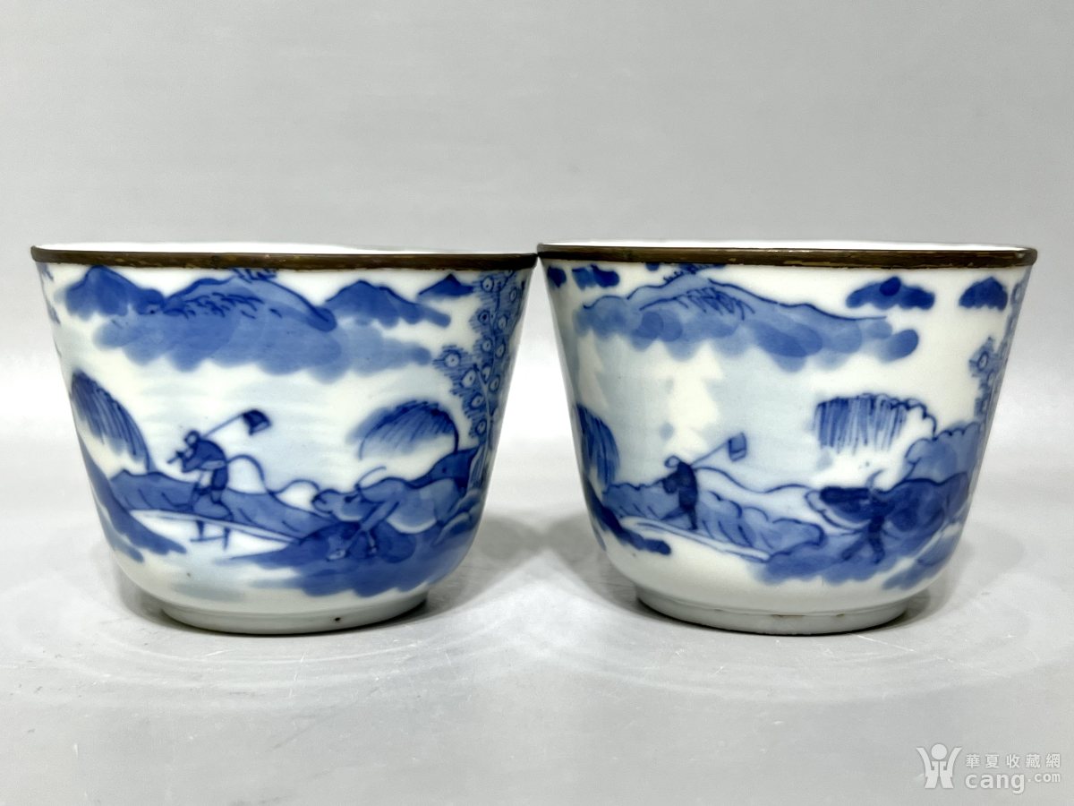 清代精品青花渔樵耕读纹杯一对