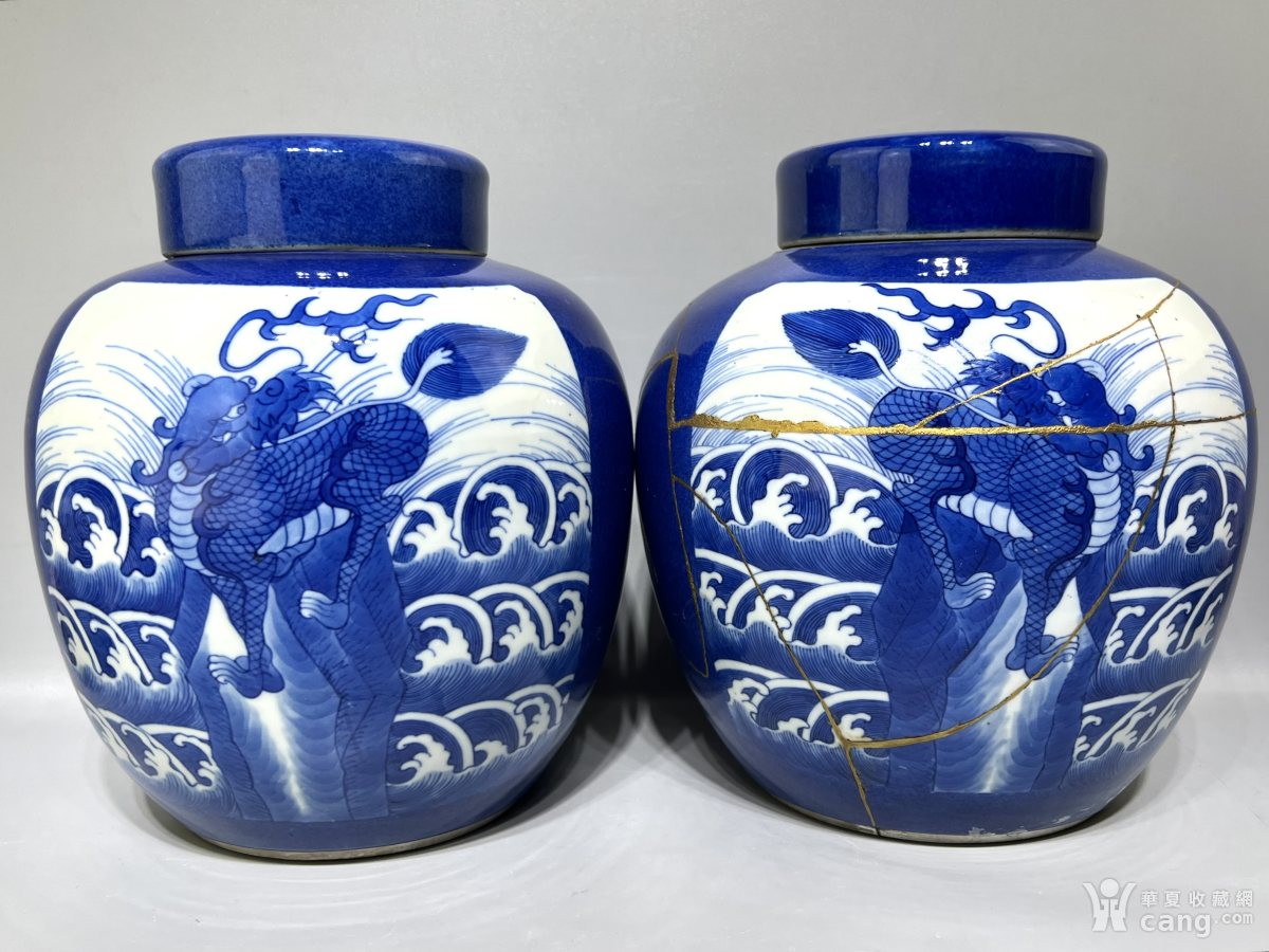 晚清精品洒蓝开窗青花海兽纹平盖罐一对