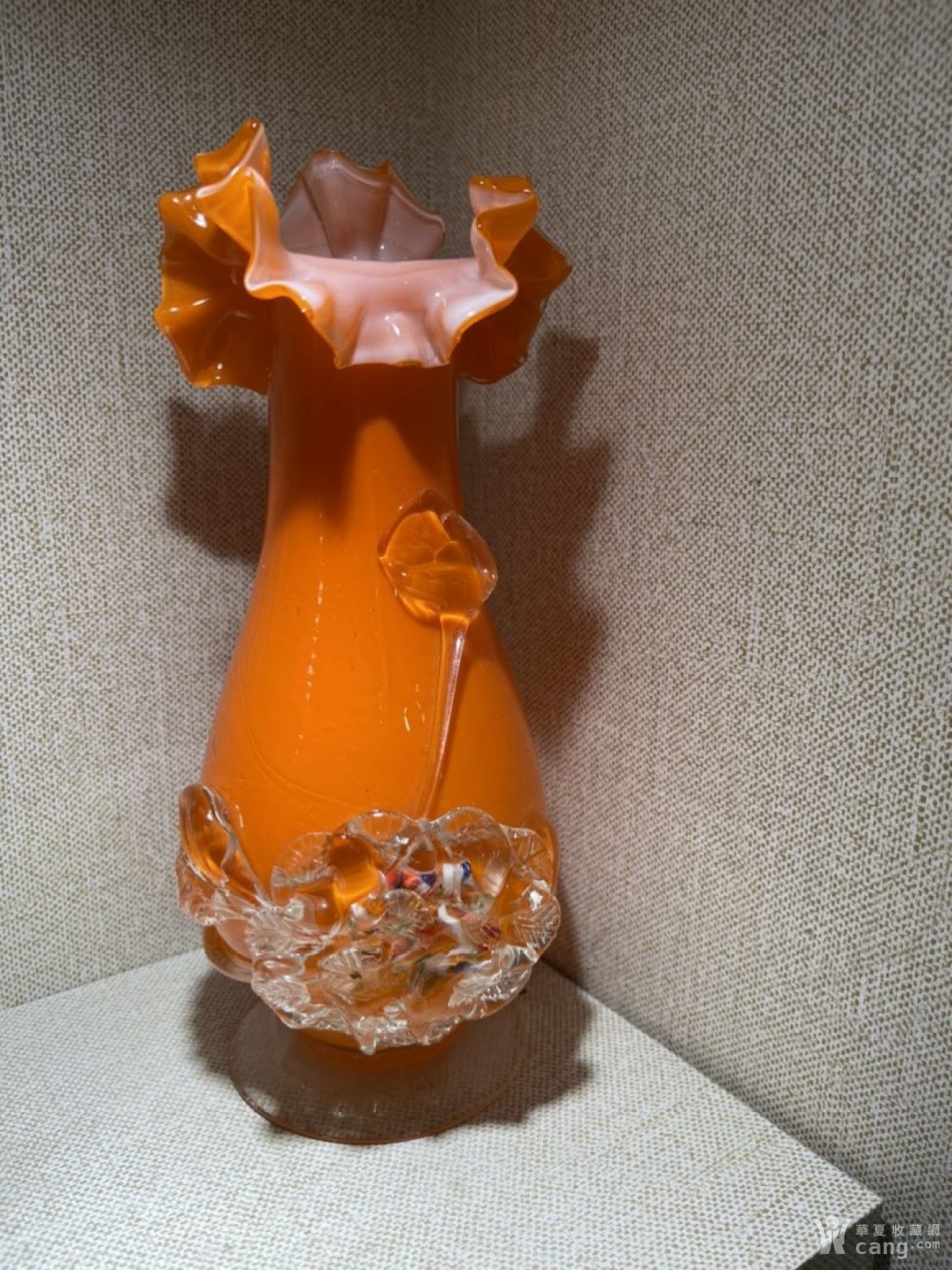 6070老物件 上翻花下堆花少见全品橘黄色纯手工花瓶