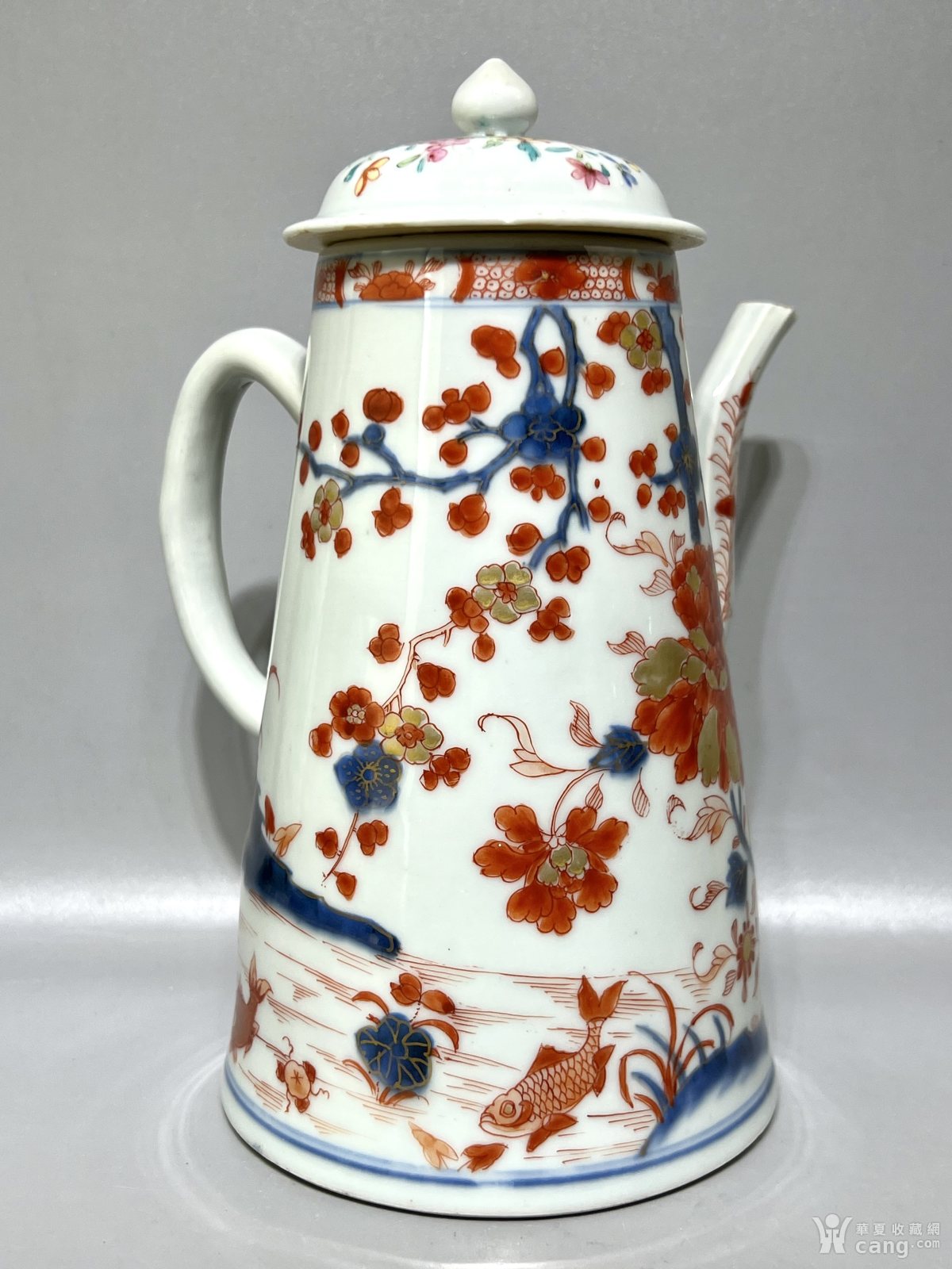 清康熙精品青花加矾红描金鱼藻花卉纹执壶