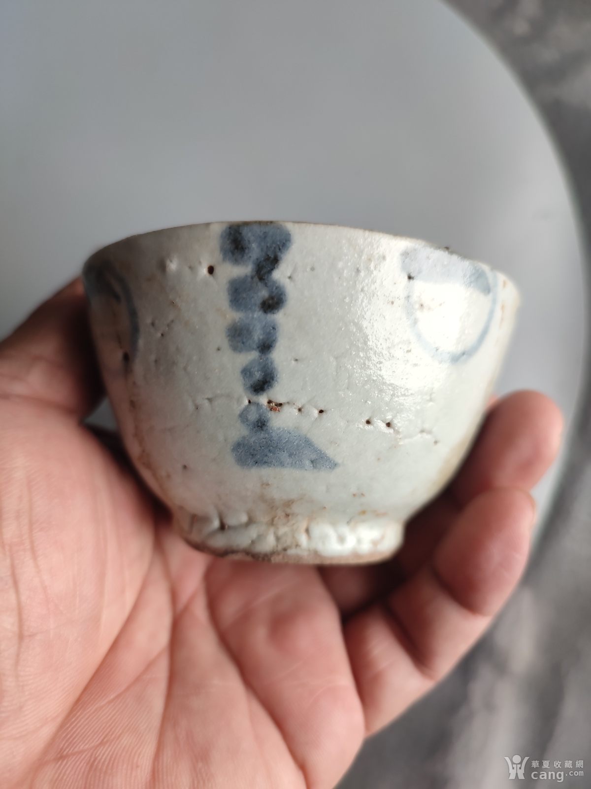 有冲线,有小磕的清代早期瓷器杯子,口径8厘米
