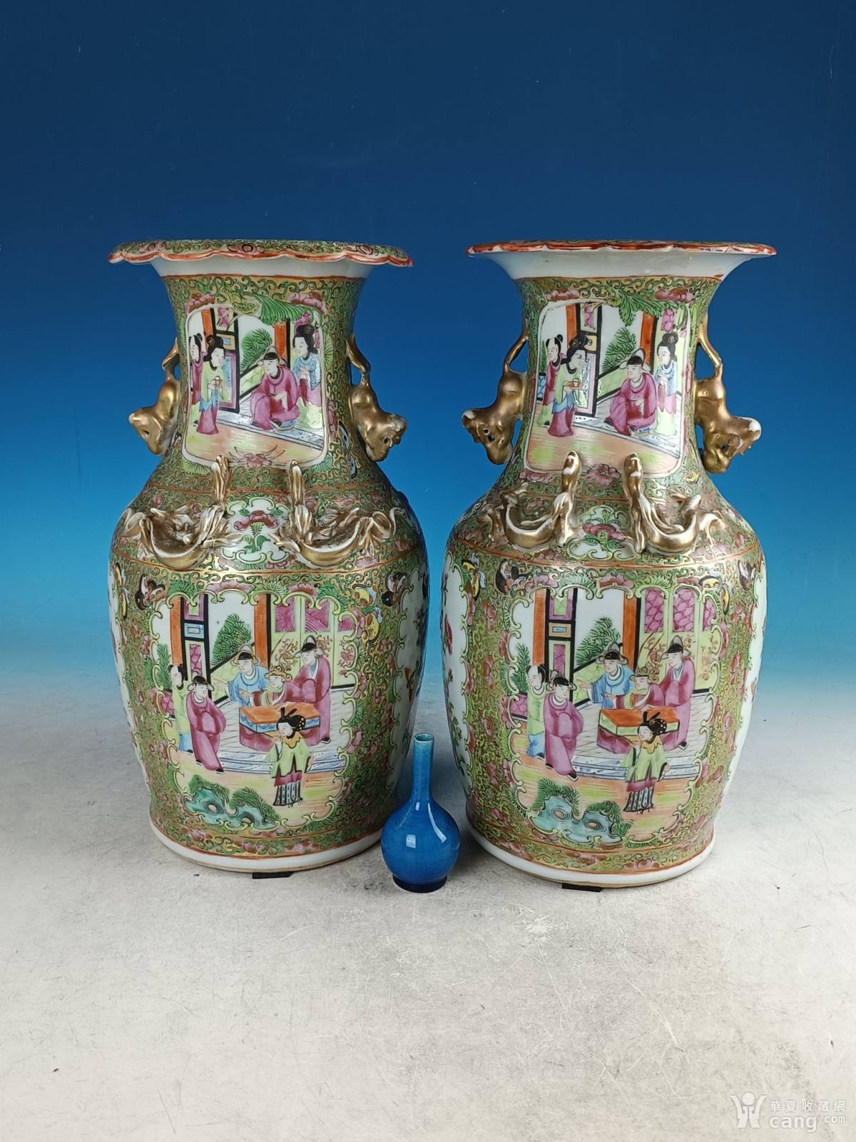 清咸丰绿广彩广彩开窗西厢记人物花鸟狮耳大瓶一对