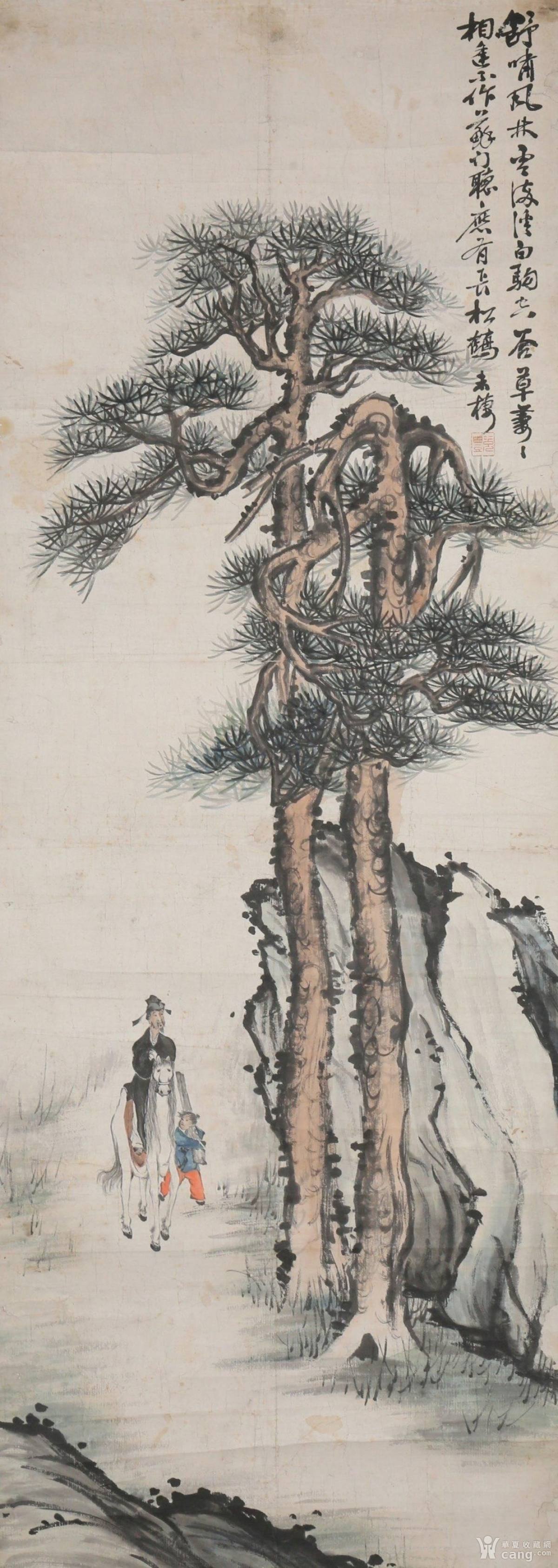 民国佚名 携琴游山图 纸本镜片 旧裱