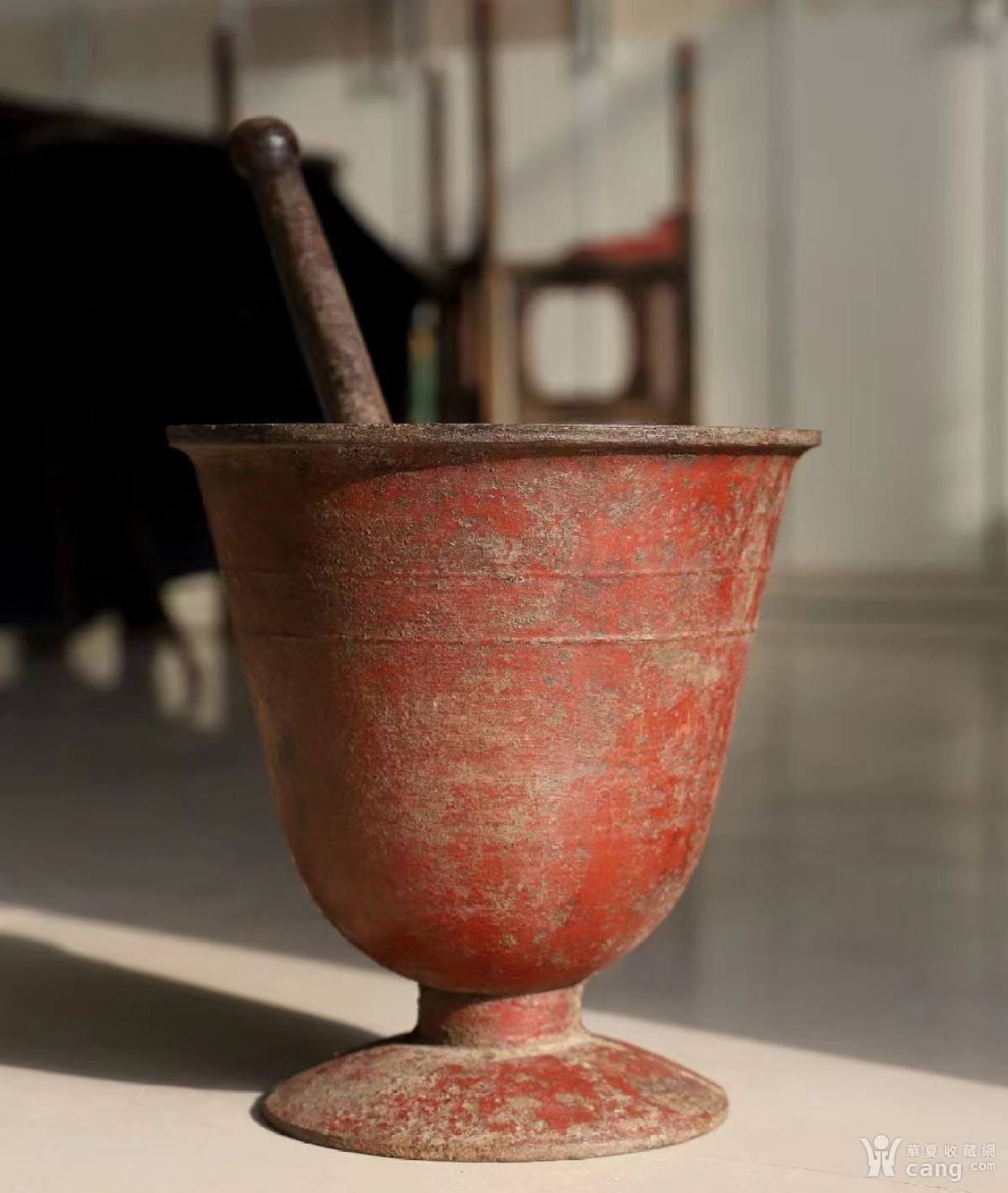 捣药器,清代喇叭口铸铁置铁臼,器型饱满,形制美观,品相完美,