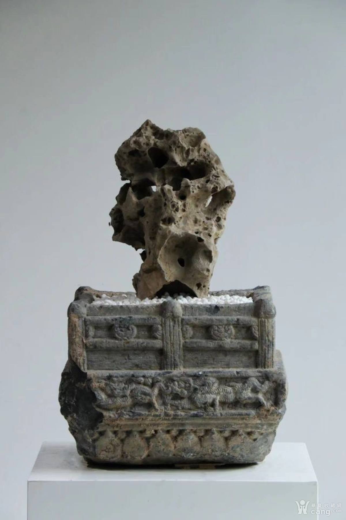 金元赏石座,正面雕刻龙纹,两侧雕刻花卉,上部雕刻围栏,形制精