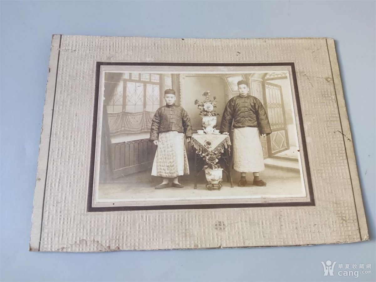 民国拍摄头戴瓜皮帽身穿长袍马褂的兄弟二人合影老照片
