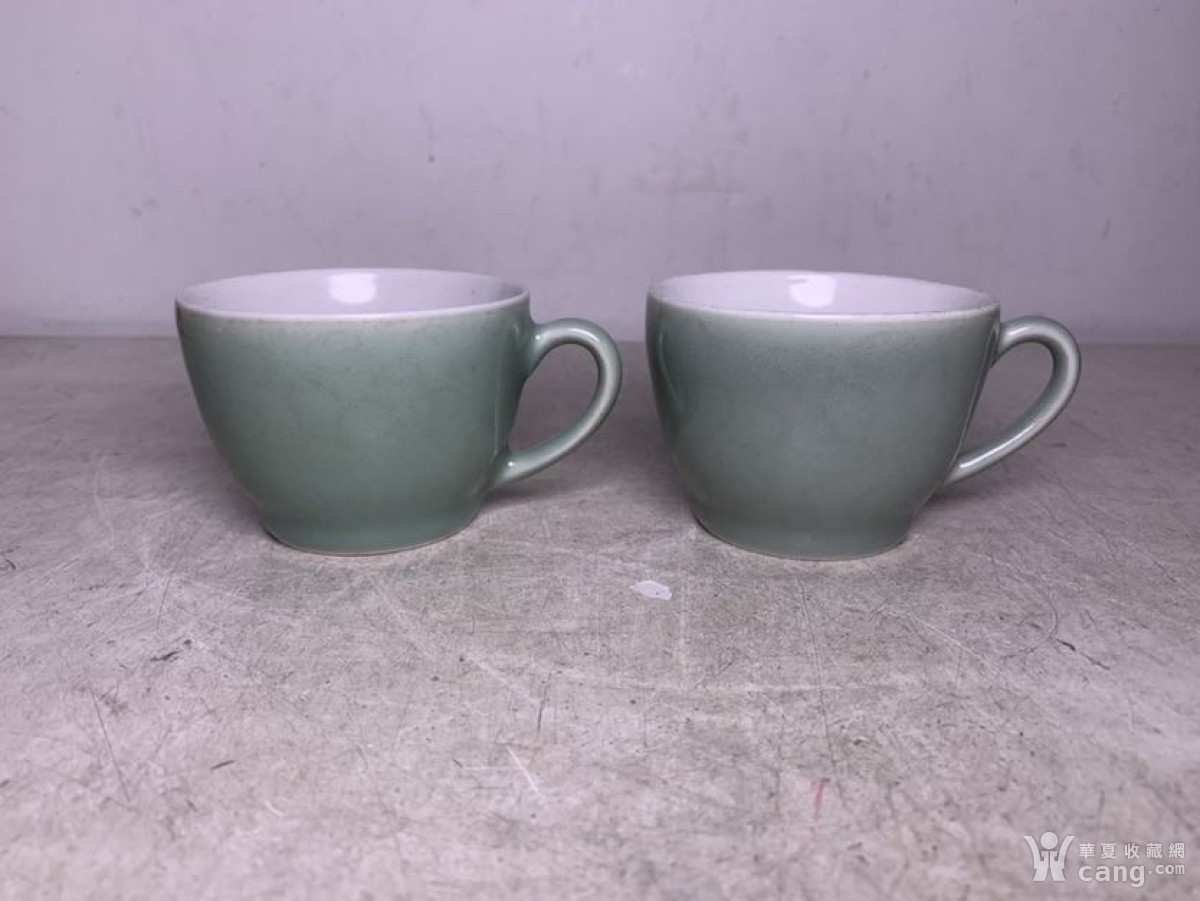 一对七十年代宜兴青瓷暗刻花卉茶杯柄杯耳杯