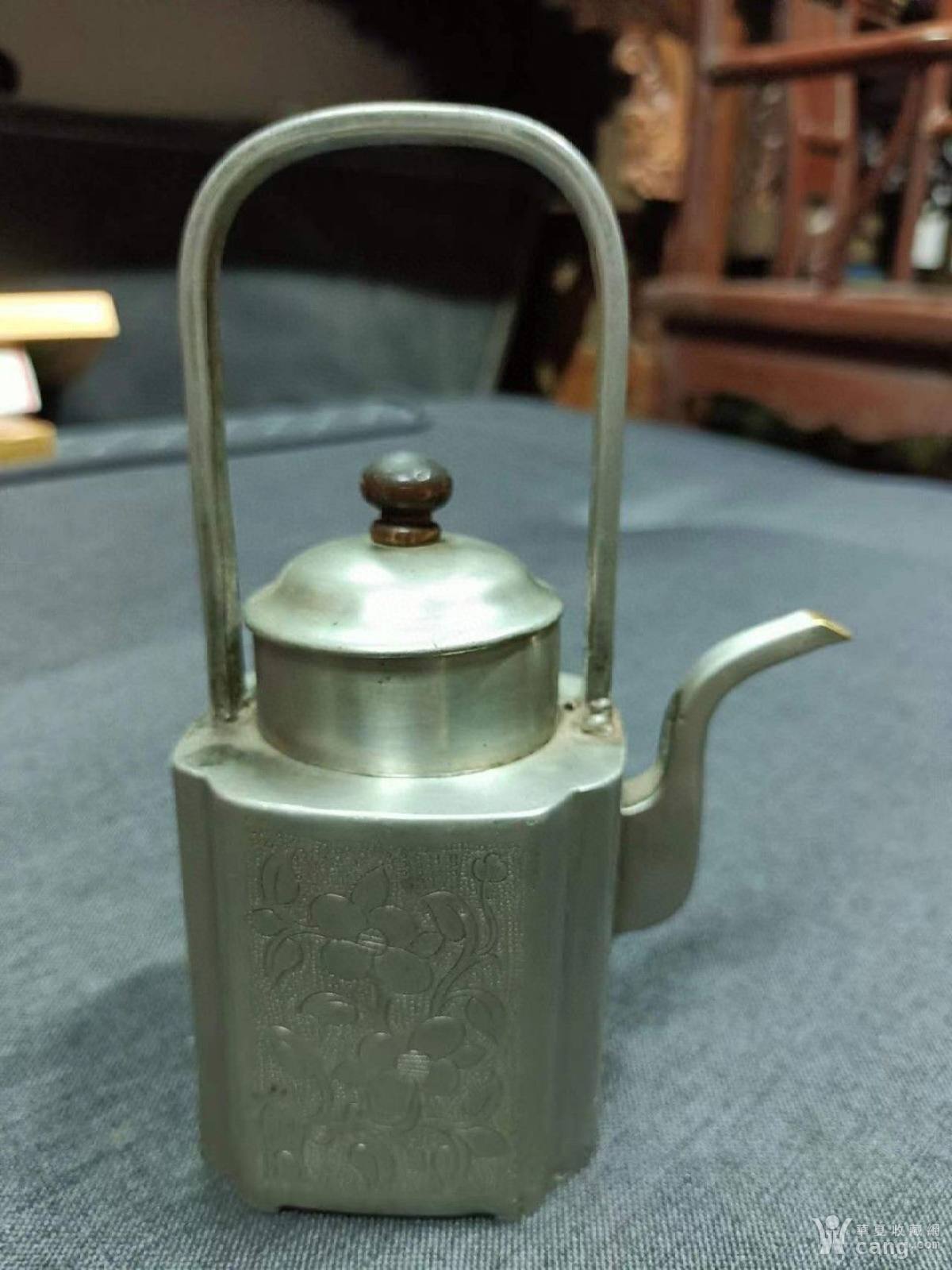 清代满工錾刻花卉白锡提梁壶