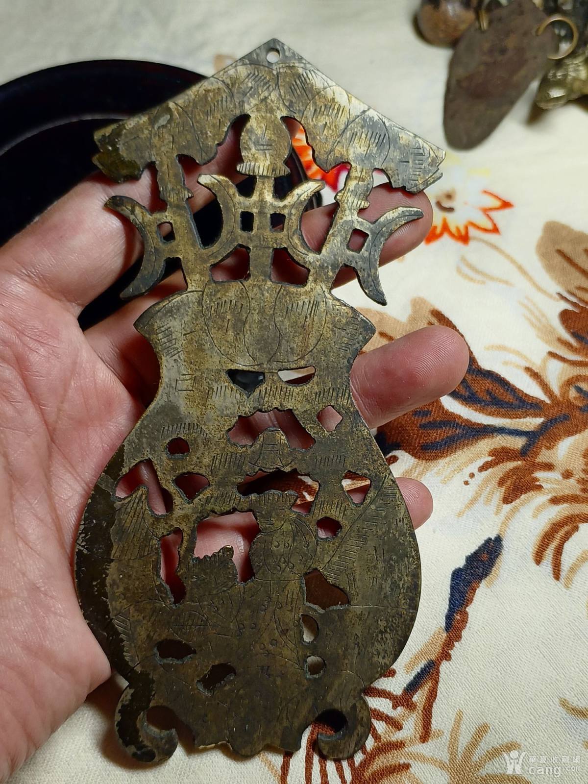 清末老铜鎏银双面工缕空和合二仙宝瓶饰件