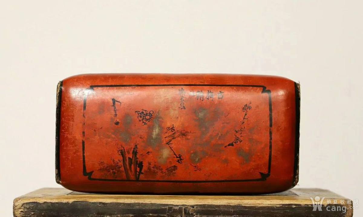 朱漆描画皮脉枕,清早期,两面描画两面写有字体款号,长33宽1
