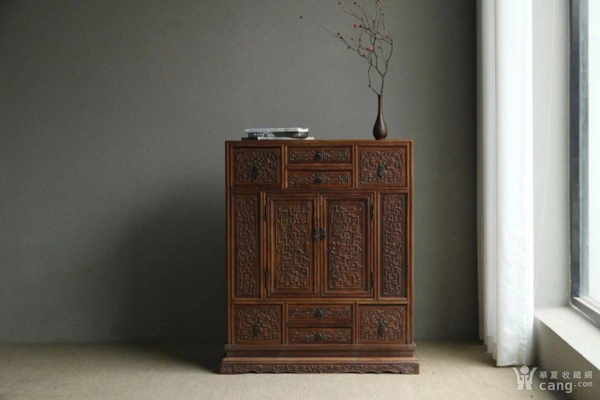 清中期黄花梨藏宝柜,上下分布大小八个抽屉,中间对开上门,储物