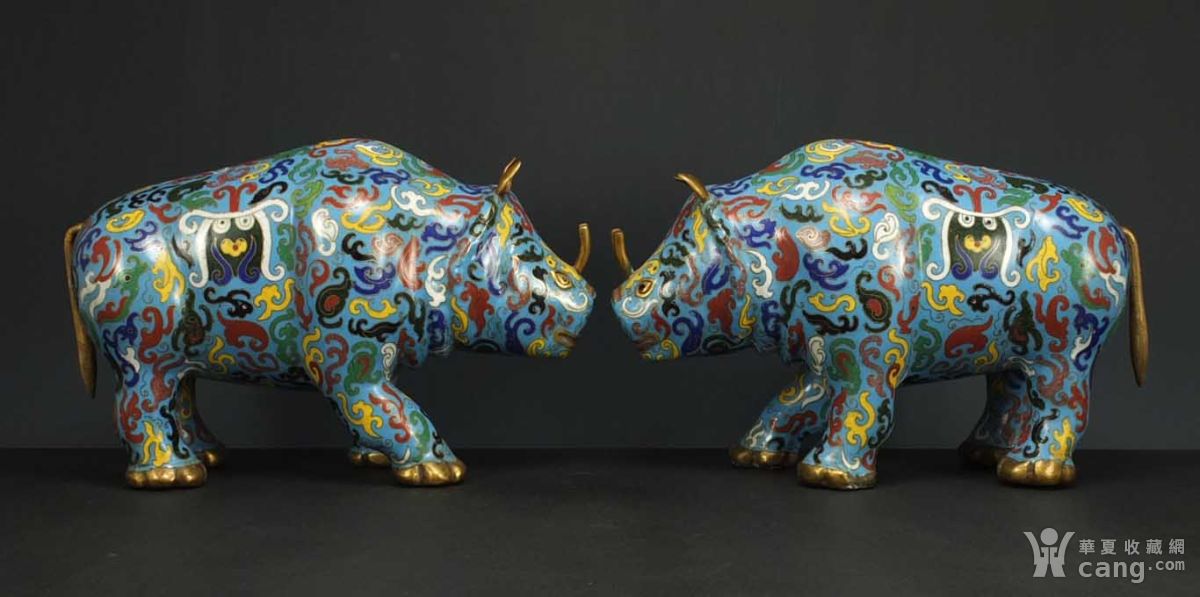 清代铜胎掐丝珐琅 硕大河马 摆件一对