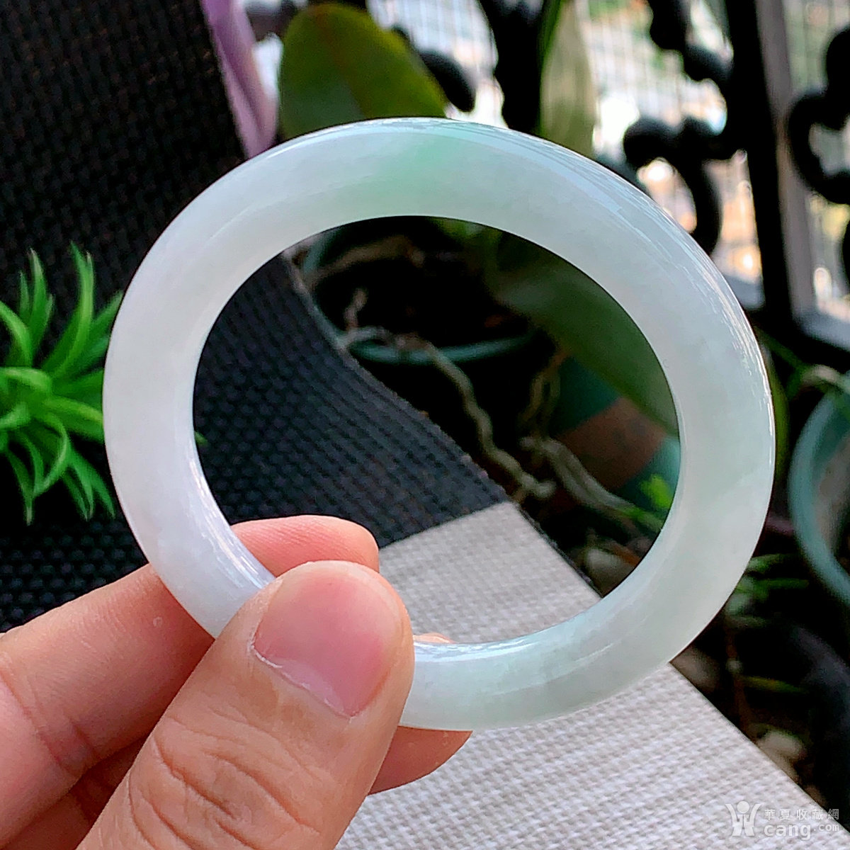 缅甸天然翡翠A货冰透水润飘绿圆条手镯55.6圈口