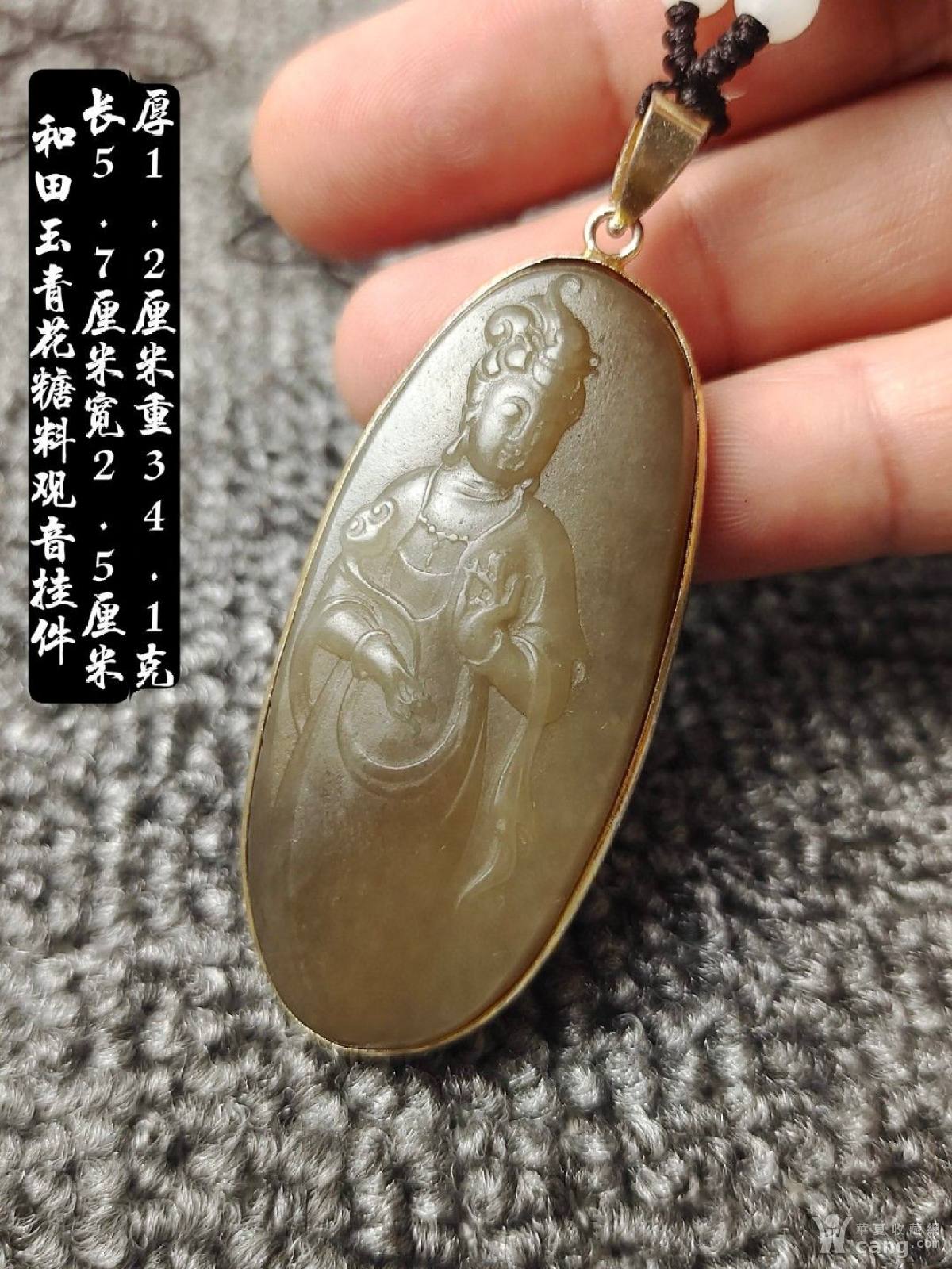 和田玉青花糖料雕观音挂件 原石老料,精工细琢,玉质温润,糖