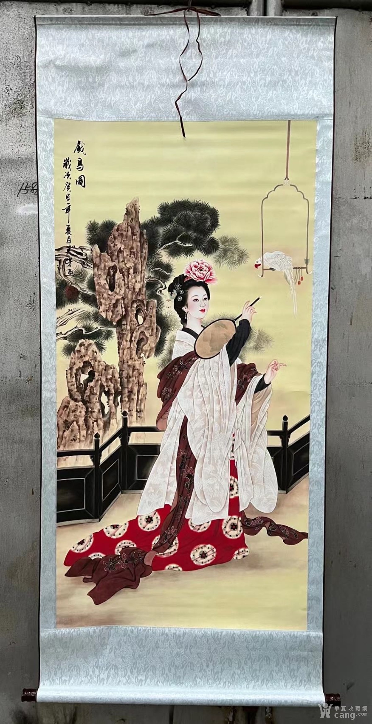 王美芳工笔《仕女戏鸟》