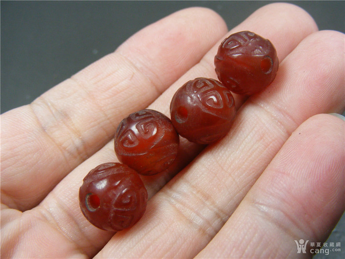 6 几十年的红色缠丝玛瑙双面工浅浮雕团寿纹中号圆珠4颗
