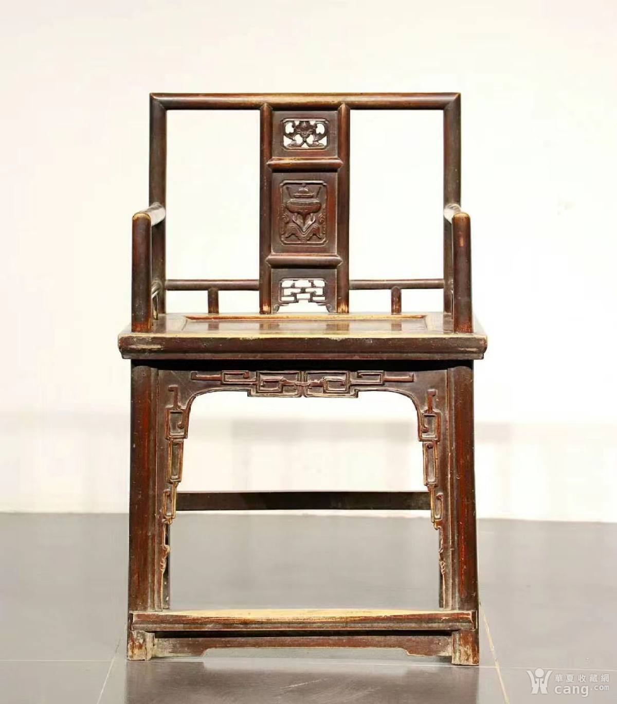 围栏式雕宝鼎玫瑰椅,背板攒框三节,上节雕蝙蝠嘴叼灵芝花纹,中